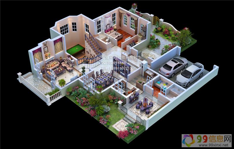 立体户型图不同于常规的效果图,例如客厅样板间,或是卧室效果图,或是一般装修公司的套图等,这些都属于单个房间的不连续表现,就是卧室是卧室,客厅是客厅,这两个空间的效果图不能在一个相机角度下完全表现出来,属于独立房间效果图表现来自www.99xinxi.net。而相对于3D户型图,它上一个连贯的多房间展示,能看到的不但是一个单独的房间,而是包含所有房间,例如客厅,餐厅,主卧次卧,卫生间及厨房等Qfj。